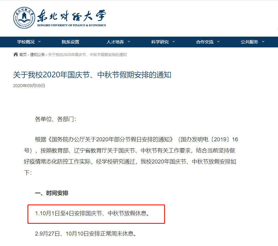 东北财经大学:10月1日至4日安排国庆节、中秋节放假休息四天。