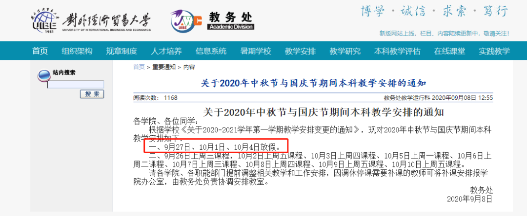 对外经济贸易大学:9月27日、10月1日、10月4日放假三天。