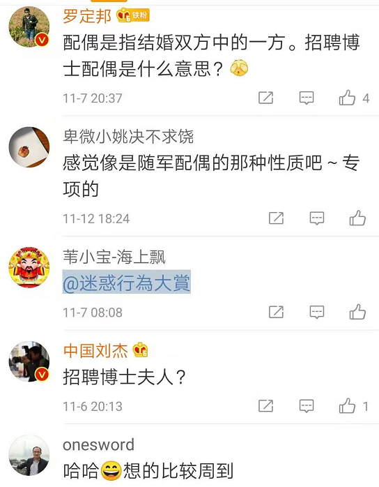 针对大家的猜测,11月12日,记者致电昭通学院负责本次招聘的工作人员。她表示,由于文件名称表述的问题,不少人误以为是“给博士招配偶”,“实际上是给博士的配偶们提供工作岗位,这是上级部门招聘的统一表述,其他学校发通知也是这样的”。