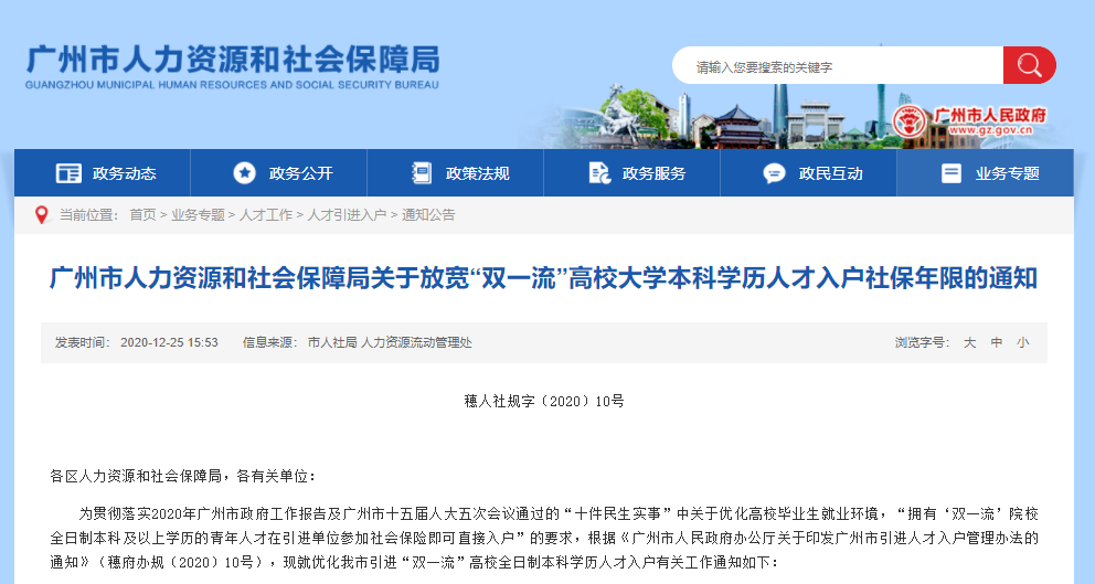 近日,广州市人力资源和社会保障局发布关于放宽“双一流”高校大学本科学历人才入户社保年限的通知,其中明确指出毕业院校为国家公布的世界一流大学建设高校或世界一流学科建设高校(即“双一流”建设高校)全日制本科及以上学历的青年人才在引进单位参加社会保险即可入户。