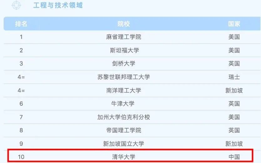 工程与技术领域中,除了前三名霸榜的美国高校,还有新加坡国立学校和清华大学也上榜,实力不可小觑。