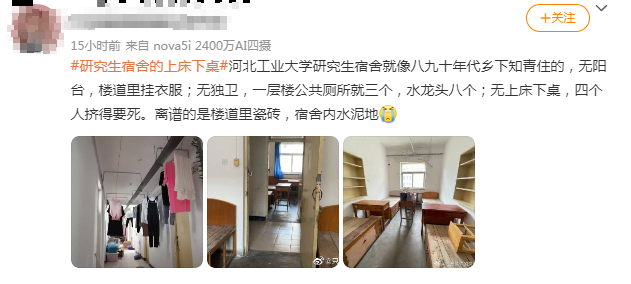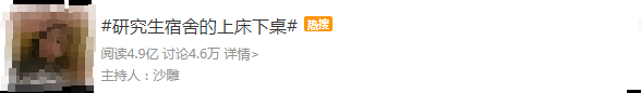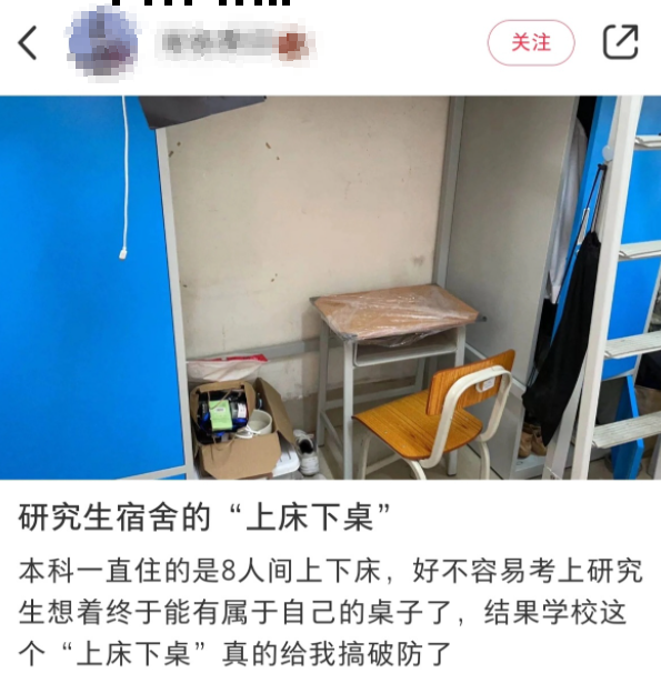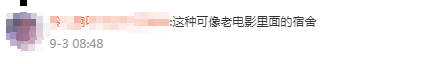 看出这位同学的崩溃了,想当年小编上学的时候前两年住在老校区,一直都是6人间无独卫,还是那种大澡堂(南方人的社恐犯了~),后来搬到新校区就好多啦!四人间的上床下桌![]()