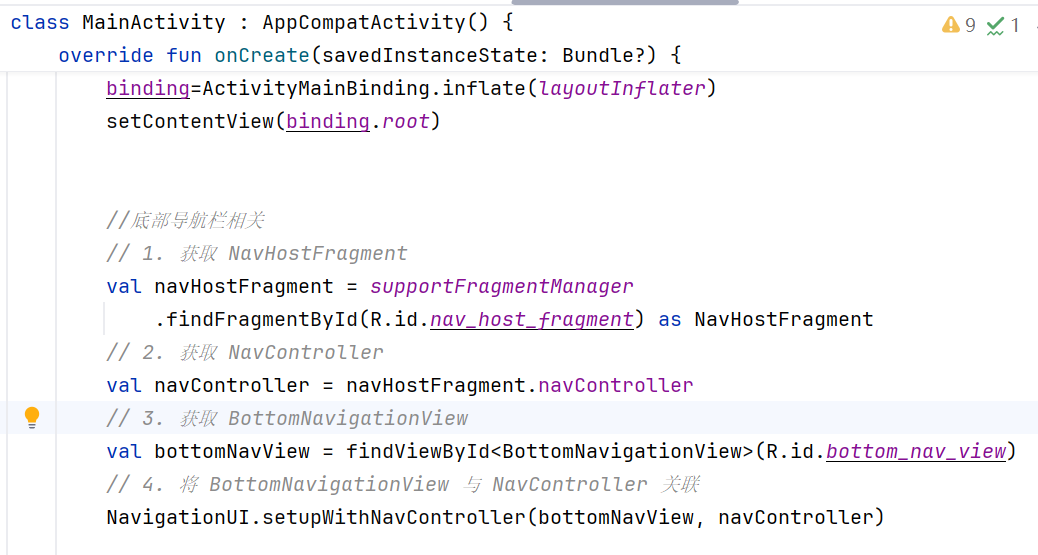 setupWithNavController():把底部导航栏和导航控制器绑定,实现点击切换页面