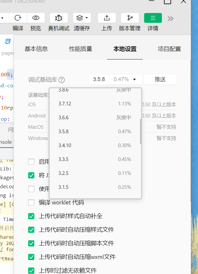 点开开发者工具右上角的详情,选择本地设置,在调试基础库中随便选一个,然后清一下缓存,重新编译