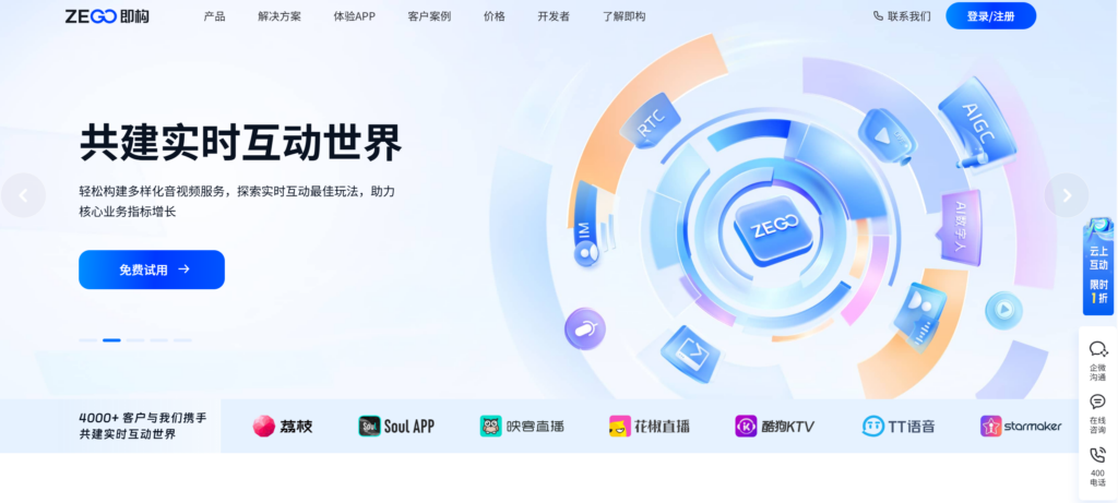 ZEGO 的音视频 SDK 支持 Web、iOS、Android、Windows、macOS、小程序等多端平台,具备全链路的弱网优化能力,包括抗丢包、动态码率调节、超低延迟等功能。此外,平台具备全球网络部署、音视频录制、内容审核、数据加密、权限控制等配套能力,助力开发者快速构建端到端的实时互动体验。凭借技术深度与服务能力,即构科技已被众多头部企业采纳,是国内音视频通信领域颇具代表性的技术厂商之一。
