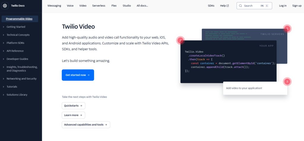 Twilio Video 提供灵活的 API 和强大的服务端控制能力,支持 WebRTC 标准和多种客户端 SDK(包括 JavaScript、iOS 和 Android),使开发者可以快速构建跨平台的视频通信功能。其平台还具备网络质量监测、录制功能、媒体同步、多端协作、身份验证等功能模块,并与 Twilio 的语音、短信、身份验证产品无缝集成,帮助企业打造一体化通信解决方案。适合中大型企业和希望构建全球化视频通信能力的开发团队。