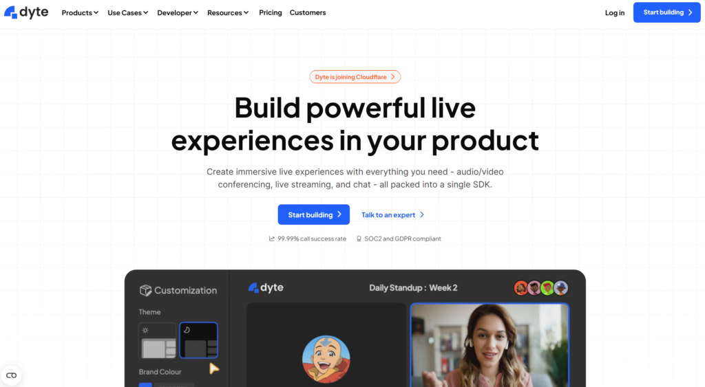 Dyte 是一家面向开发者的现代化音视频通话 SDK 提供商,成立于 2020 年,总部位于印度,以灵活的嵌入式视频通话解决方案著称。Dyte 提供低代码和完全可定制的 API 接口,支持在网页、移动端和桌面端快速集成音视频通信功能。其平台采用 WebRTC 架构,优化了低延迟、带宽自适应以及弱网环境下的音视频质量,适合构建远程会议、在线教育、医疗远程问诊等实时互动场景。