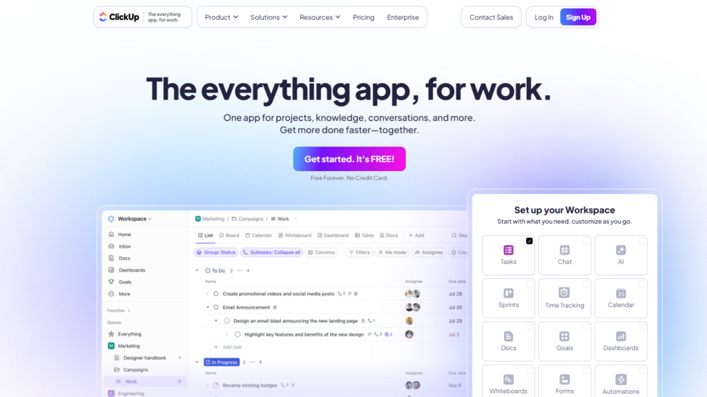 ClickUp 是一款集项目管理、任务协作和流程自动化于一体的多功能平台,面向希望集中管理多个项目和团队的企业用户。它支持列表、看板、甘特图、日历、表格等多种视图,并具备跨项目筛选、目标追踪和多维报表等功能,适合在高强度多项目并行环境中使用。