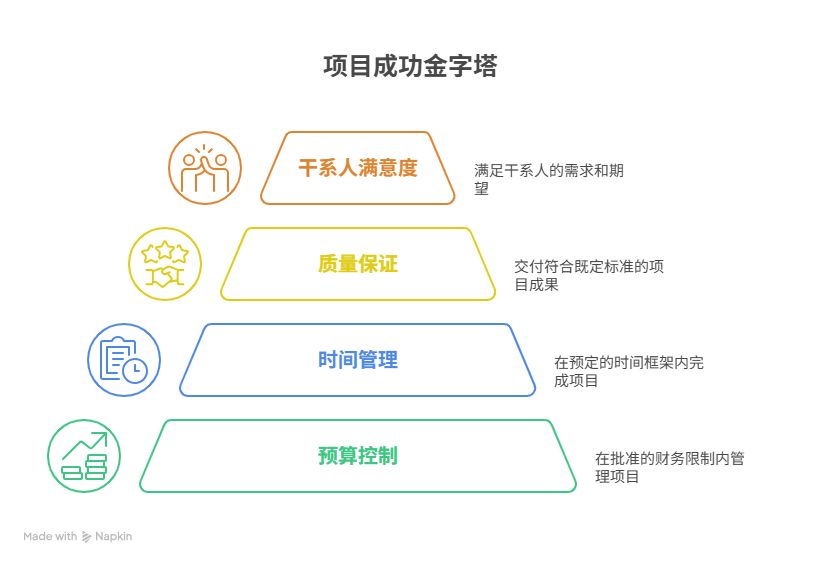 除了时间、成本和质量三大目标外,干系人的满意度也是项目管理不可忽视的核心目标。干系人包括客户、投资人、团队成员、政府机构乃至社会公众。若忽视他们的期望,即便其他指标达成,项目仍可能遭遇阻力。