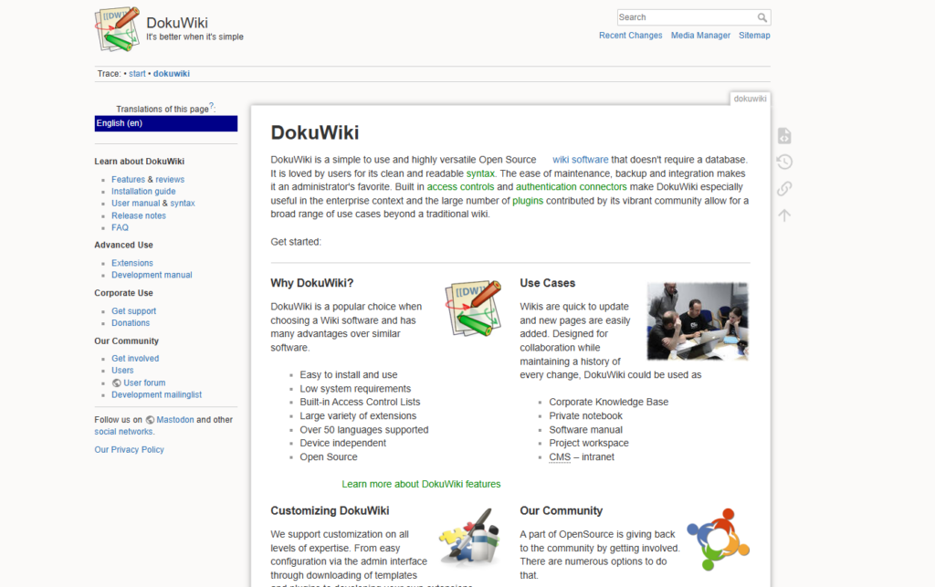 核心功能: 无需数据库,易于安装和维护;支持版本控制与差异对比;拥有访问控制列表(ACL)进行权限管理;支持丰富的格式化语法和媒体文件嵌入;可通过大量插件进行功能扩展。