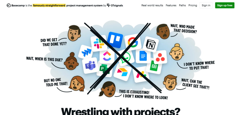 核心功能: 以项目为单位的独立工作区,集成了留言板、待办清单、文档/文件存储、日程表和实时群聊(Campfire),并提供自动的“Check-ins”提问功能。