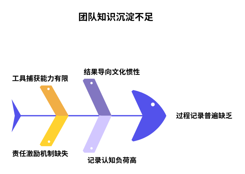 团队知识沉淀总是普遍缺乏过程记录,其根本原因在于结果导向的文化惯性与对过程价值的普遍忽视、记录行为本身的高认知负荷与即时成本、现有工具在捕获动态与非线性过程上的局限性、以及缺乏明确的责任界定与有效的激励机制。