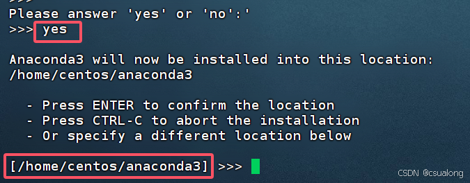 会提示默认安装路径。默认安装路径是当前用户centos的主目录,会在该目录下创建一个anaconda3目录,Anaconda的文件会部署于此目录下。这里选择默认位置即可,如个人有特别需求可按照提示设置为different location。直接按回车键即为选择默认路径。