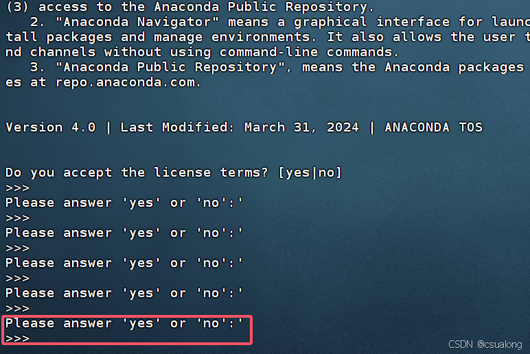 之后会有很长的文字描述,理论上是需要使用者进行阅读的(全英文),实际操作中按住回车键即可,直到出现Please answer 'yes' or 'no'的提示。