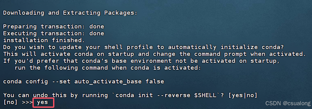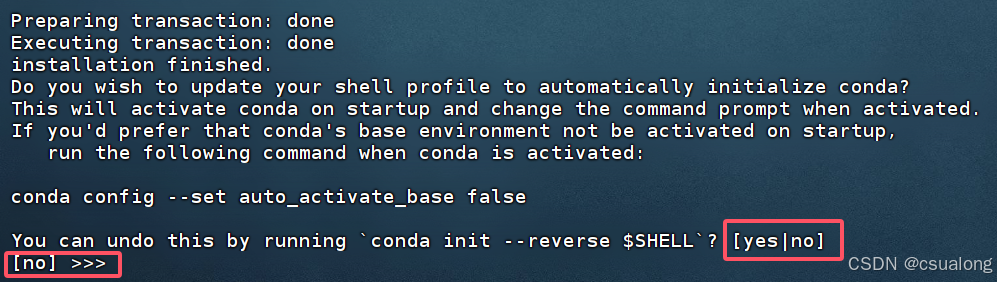 此处的提示为是否将你的shell更新为自动初始化conda,如果输入yes,则base环境会被自动激活,如果输入no,(默认是no选项,也可以什么都不输入直接按回车键),则base环境不会被自动激活。