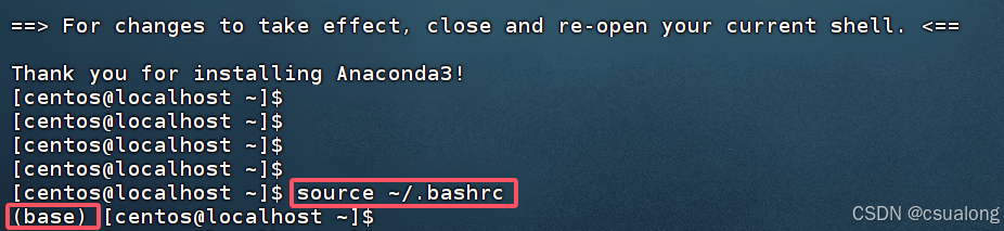 终端刷新后,会在用户centos命令行的最前端出现(base)。