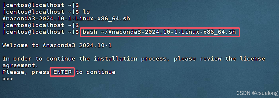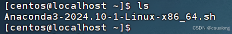 本文将Anaconda3-2024.10-1-Linux-x86_64.sh文件存放在了普通用户centos默认的主目录下。