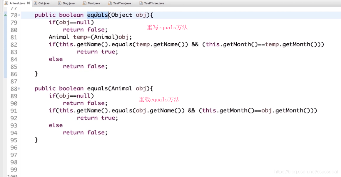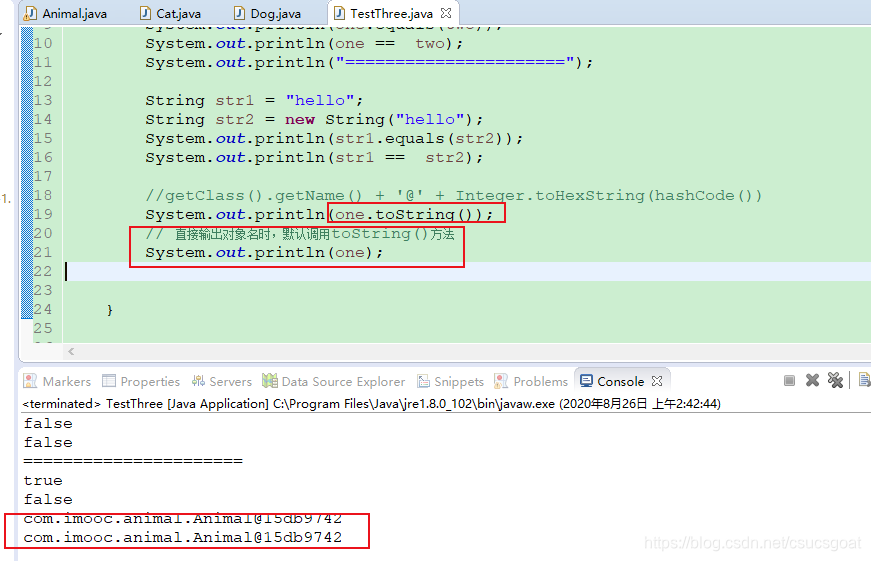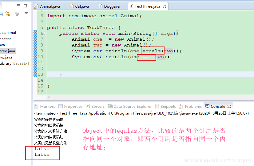 equals(Object obj)方法:判断调用equals方法的引用和传进来的参数对象引用,两个引用是否一致,即这两个引用是否指向的是同一块内存地址,返回值为boolean;即一个类中,如果没有重写equals方法,那么此时该类(继承过来的)equals方法和“==”的作用是一样的,所以,equals是在类型中经常重写的一个方法;(如String类中重写了equals方法,使其的作用是判断两个字符串的值是否相等);