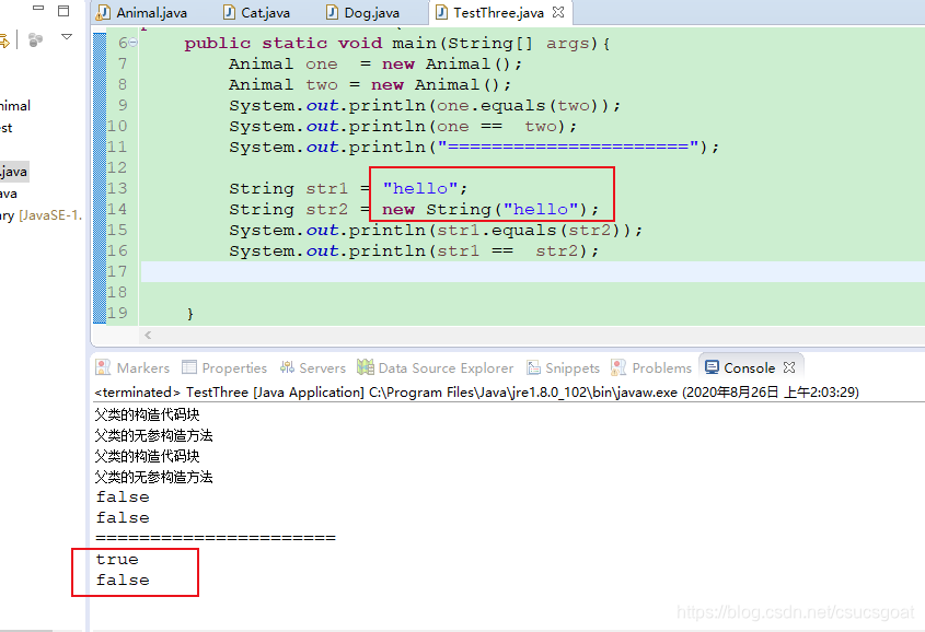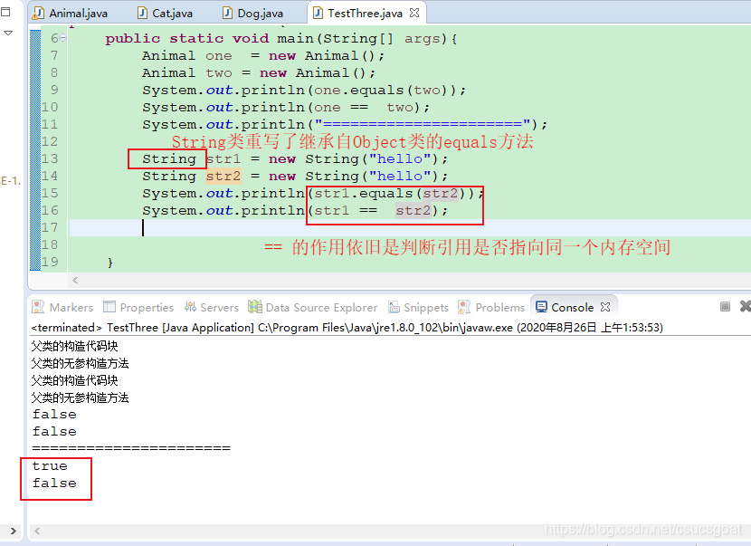 - 由于s1与s2中存放的地址不同,所以输出false。因为,类String重写了equals()方法,它比较的是引用类型的 的值是否相等,所以输出true。即结果为false、true。