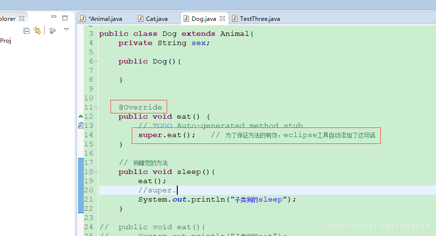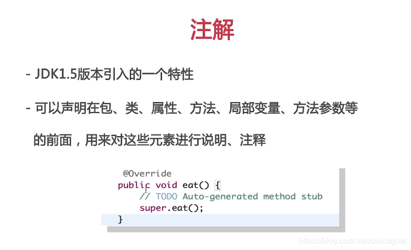 注:工具看到eat方法被Override修饰后,其会自动核查父类中是否有可以被重写的eat方法,如果没有会报错