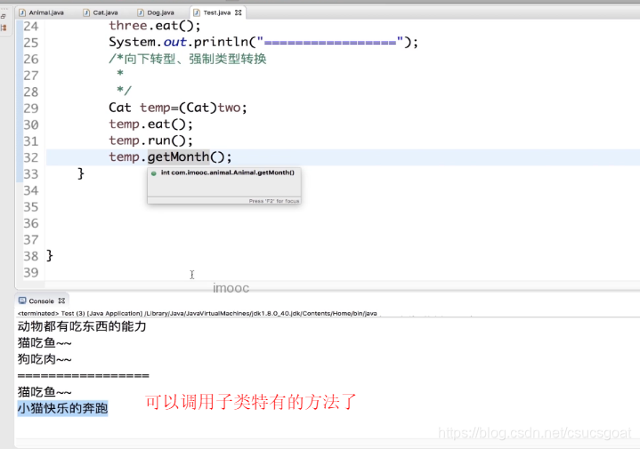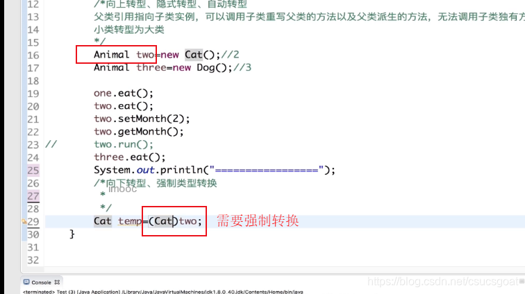 向下转型:子类引用指向父类实例对象;向下转型又称为:强制类型转换;