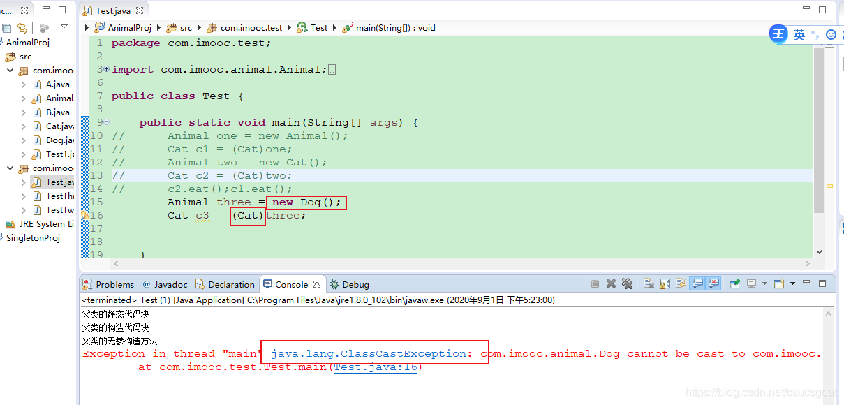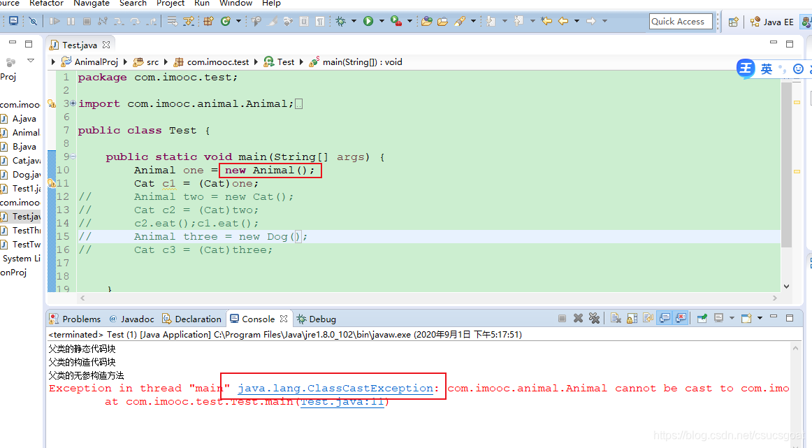 three是:Animal父类引用指向Dog子类对象;发现语法编译没报错,但运行时报错了,类型转换失败。