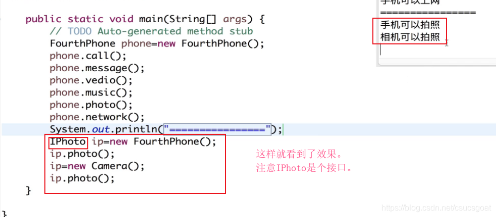 注:如上,IPhoto ip = new FourthPhoto();接口引用指向实现类时,该ip只能调用接口中的方法,而不能调用FourthPhoto()类中自己定义的方法。(经验证:一般的父类引用指向子类对象的情况下,其也只能调用父类中的方法,和子类重写父类的方法,而不能调用子类新增的特有方法)