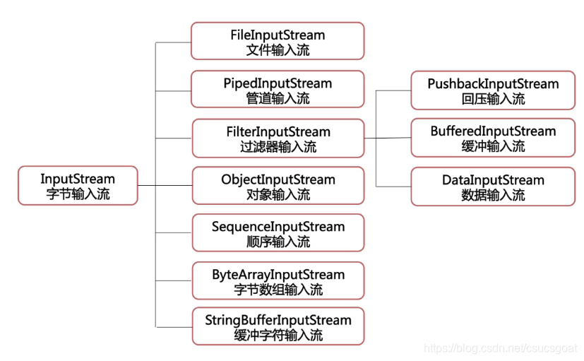 ●字节输入流的父类是:ImputStream类,其包括多个子类。