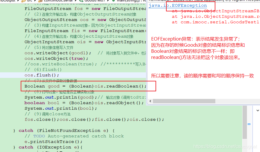 (2)可知我们存的时候,是先存的Goods对象,后存的Boolean对象,自然读的时候,先读出来的是Goods对象,如果读的是Goods对象,而用Boolean类型对象接收会引发EOFException结尾异常。