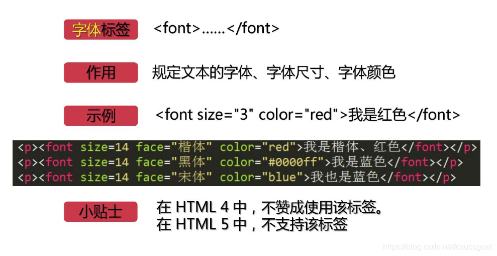 (4)h5已经不支持<font>标签了。现在可以在CSS中改变文本的字体字号颜色等;