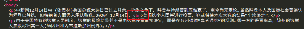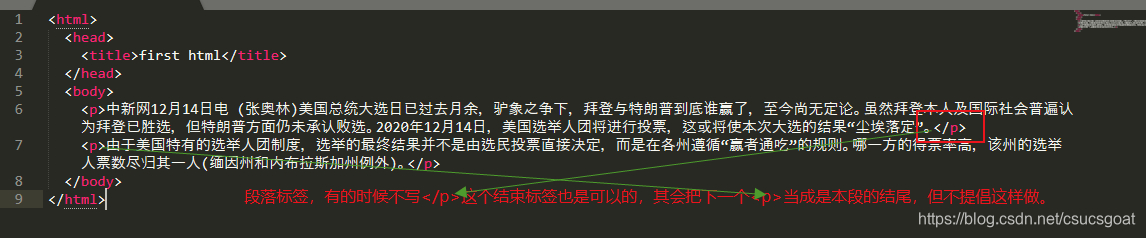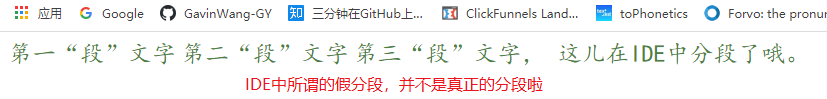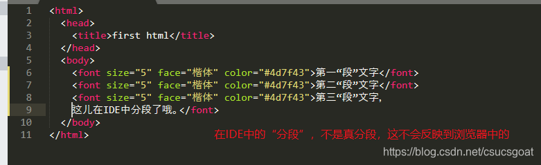 作用:主要作用是定义一个段落;因为中IDE中的文字像下图这样分段写的话,其实是再浏览器中是不会分段的,只有使用段落标签,这些不同的文字才会在浏览器中以段落形式展现。