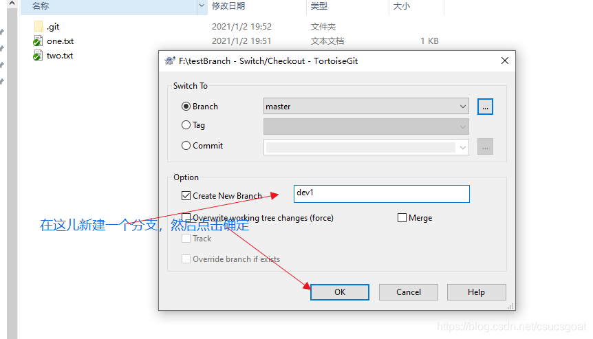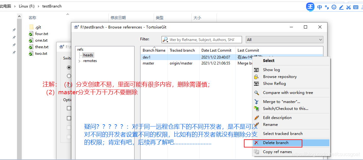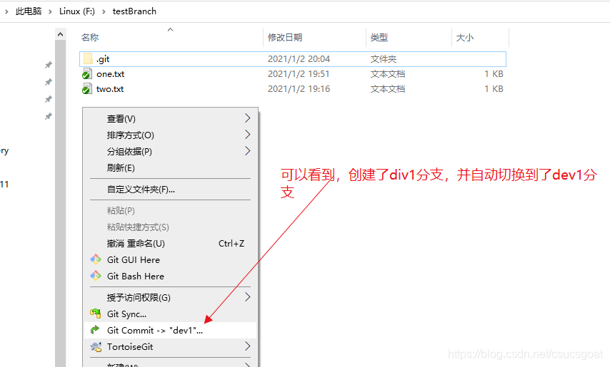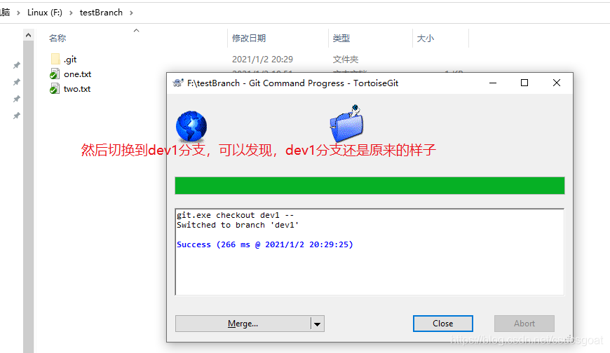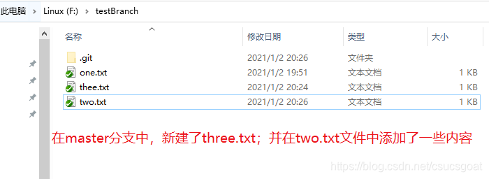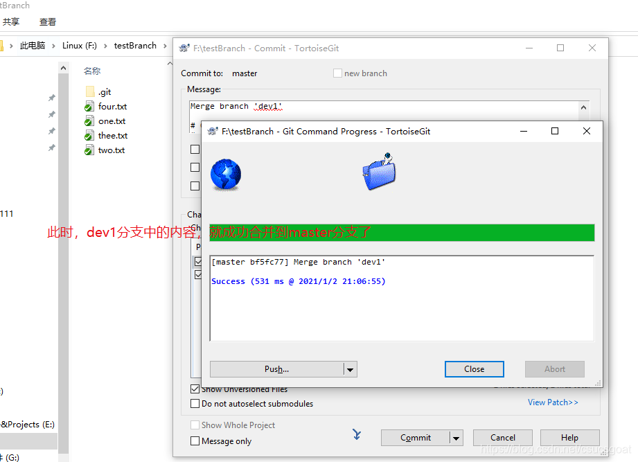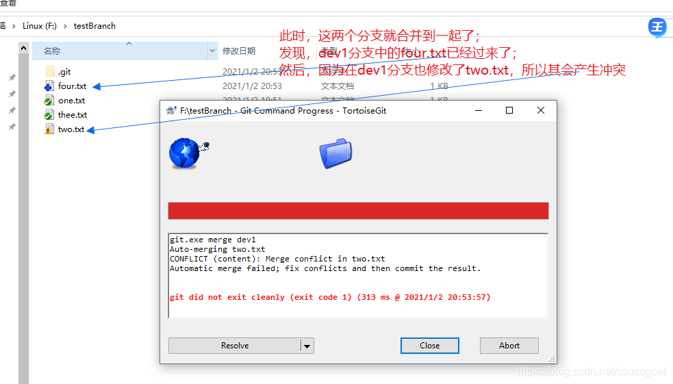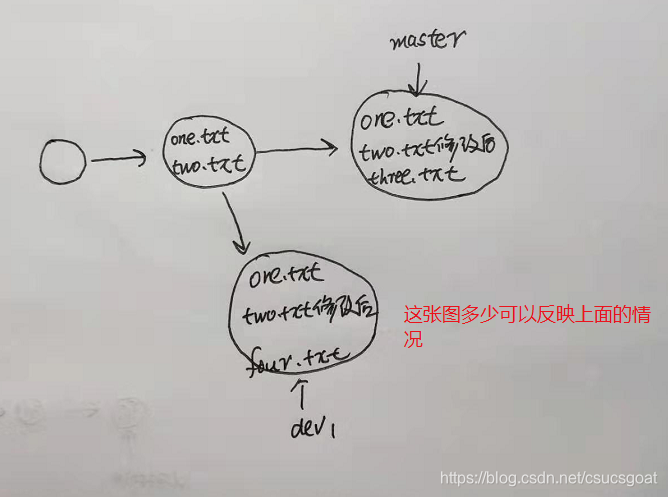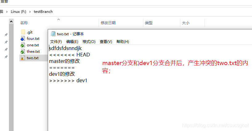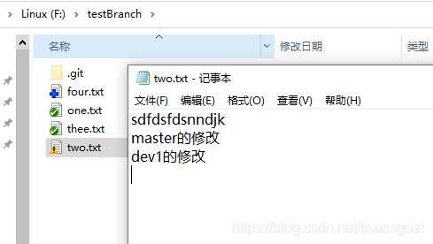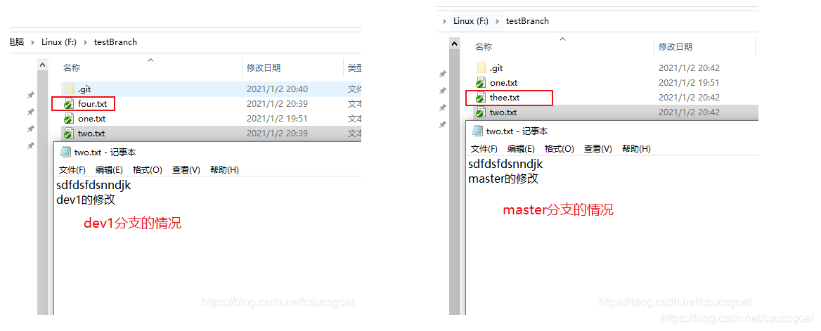 此时,如果在dev1中也修改two.txt文件,并新增一个four.txt文件:此时的情况如下