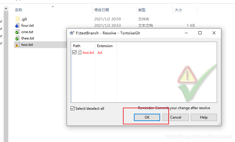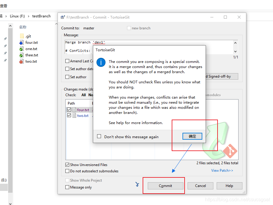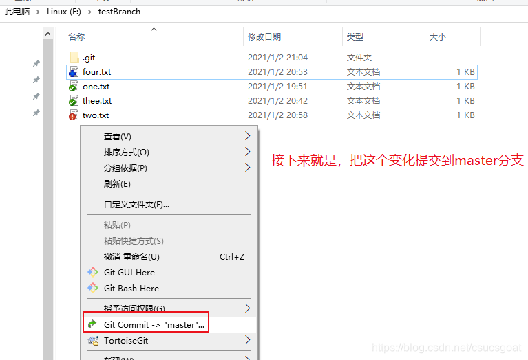 four.txt文件引进来了,然后冲突的文件也解决后,下一步就是把改变的东西,提交到master分支中: