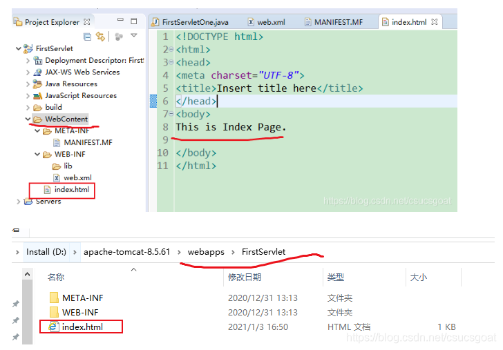 ● 在WebContent目录下创建一个index.html(岂会作为web项目的默认首页),这个html文件会自动同步到webapps发布目录中: