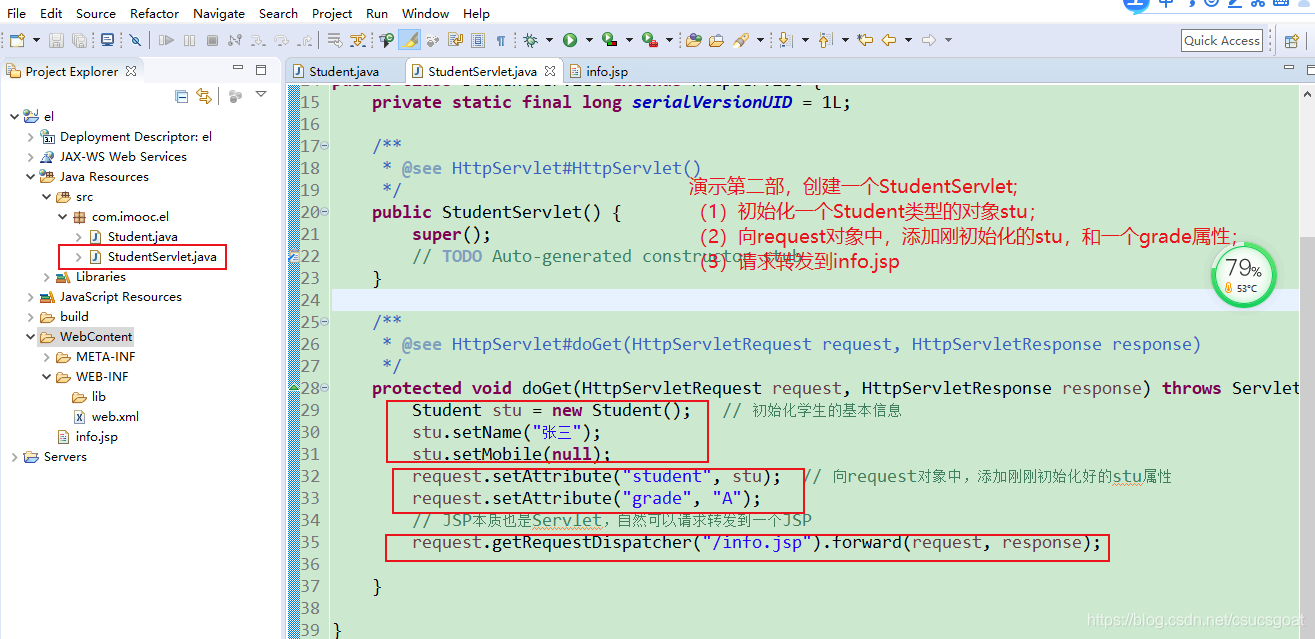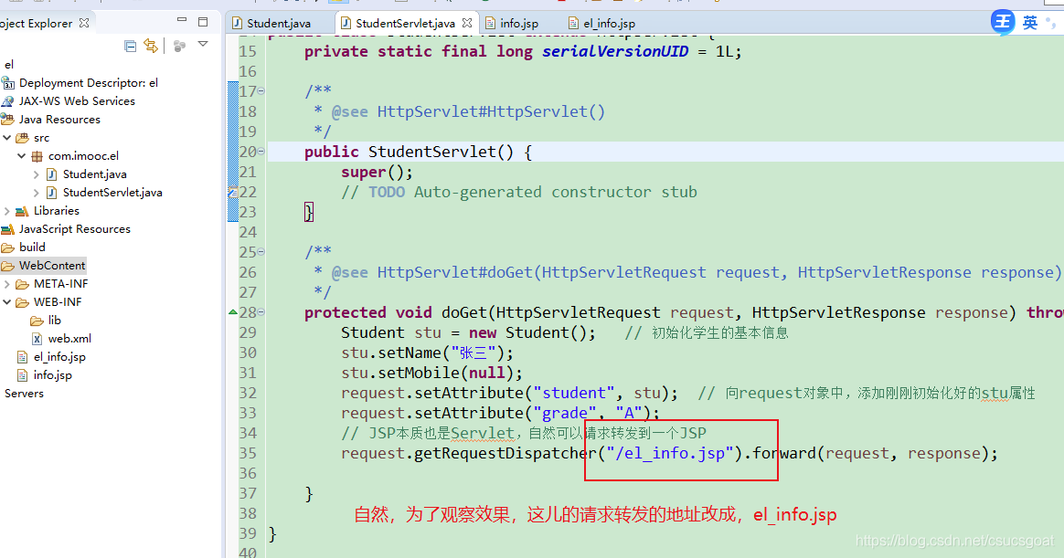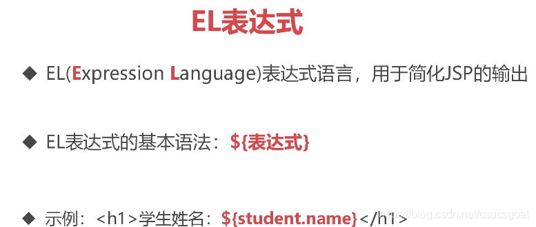 EL表达式主要是用于简化JSP的输出!即用【<h1>姓名:${requestScope.student.name }</h1>】简化【Student stu = (Student)request.getAttribute("student");out.println("<h1>姓名:"+stu.getName()+"</h1>");】;这是EL最核心的目的!!!