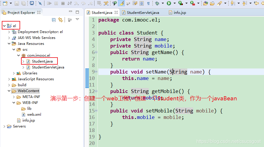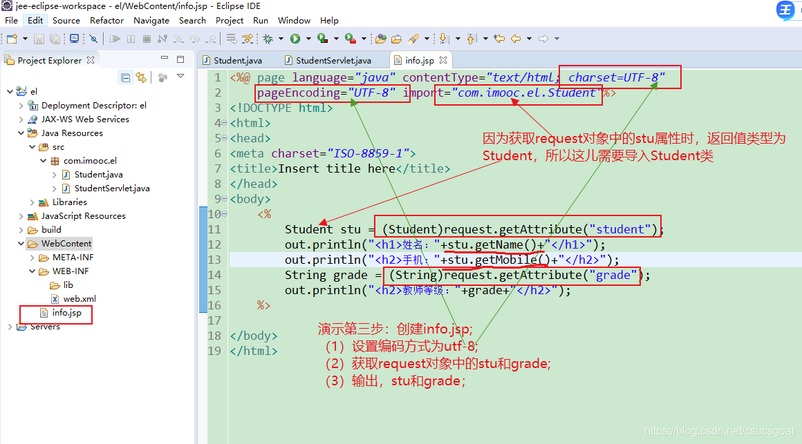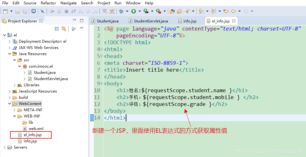 下面使用EL表达式后,既不用考虑导入Student类的问题;也不用考虑拼接字符串的问题;一切都使用了类似HTML的书写方式;在需要输出数据的地方也不用套进如<%%>等这样的代码块中,而是使用${}这样的方式,有点即插即用的赶脚,很方便;