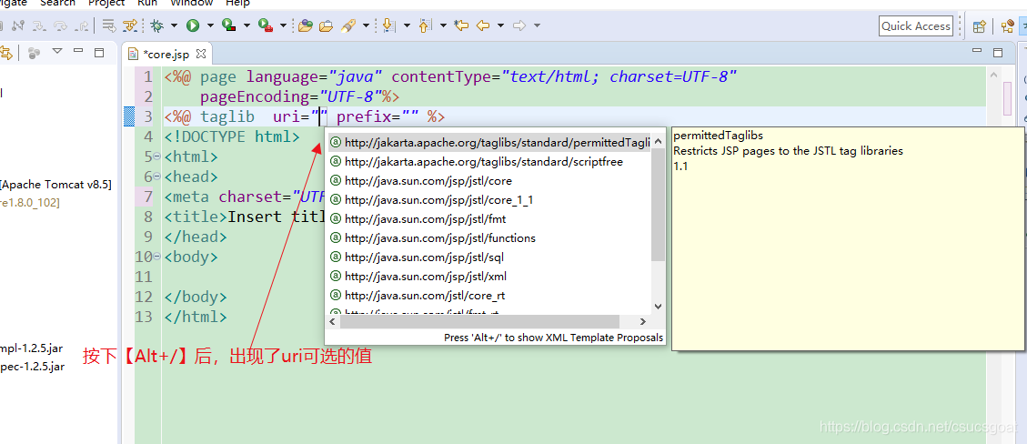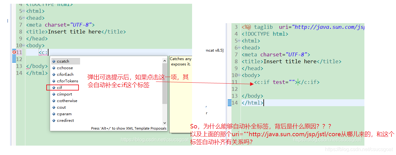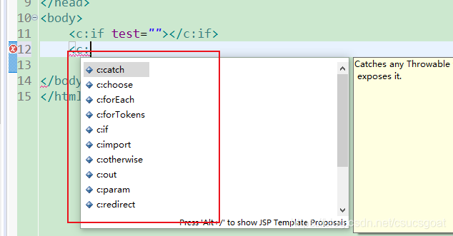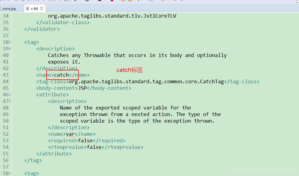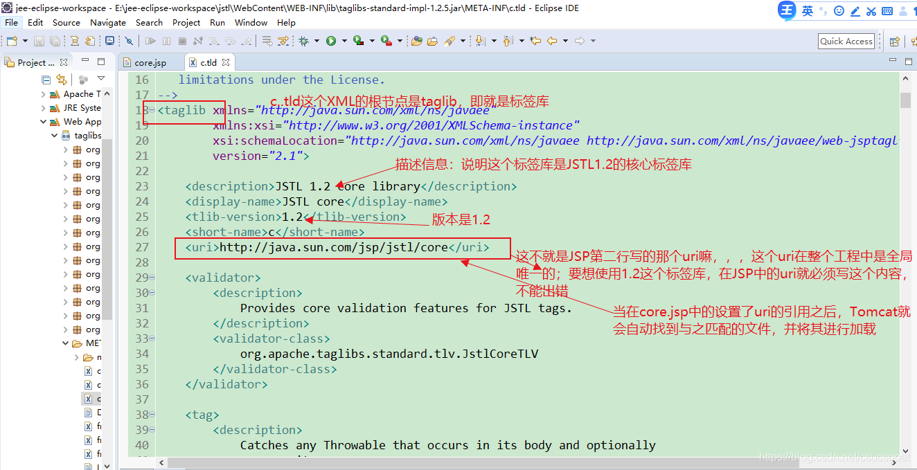 这就是为什么我们在jsp文件中,写c:后,会出现很多可选标签提示,这个列表就是从这儿来的:即Eclipse读取了c.tld文件;c.tld文件说明了所有JSTL核心库的标签的信息;ok,能懂???