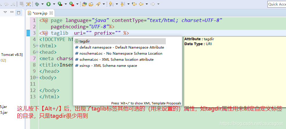 在Java或者JSP文件中,输入【Alt+/】可出现智能提示: