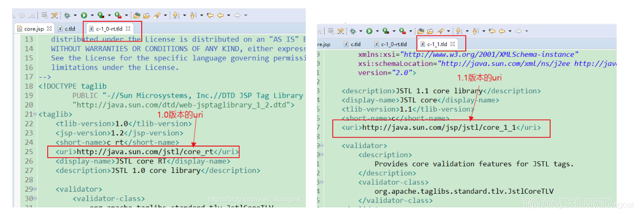 自然,如果想使用JSTL1.0版本或者JSTL1.1版本的,uri就要设置成c-1_0-rt.tld和c-1_1.tld中的<uri>了: