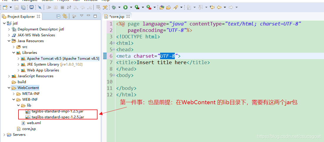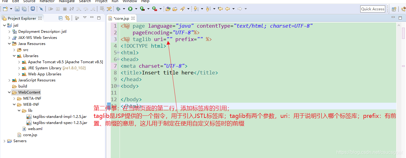 在这个JSP中如果想使用JSTL,必须做两件事:
