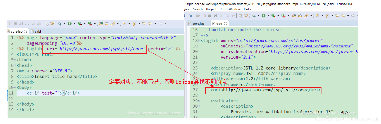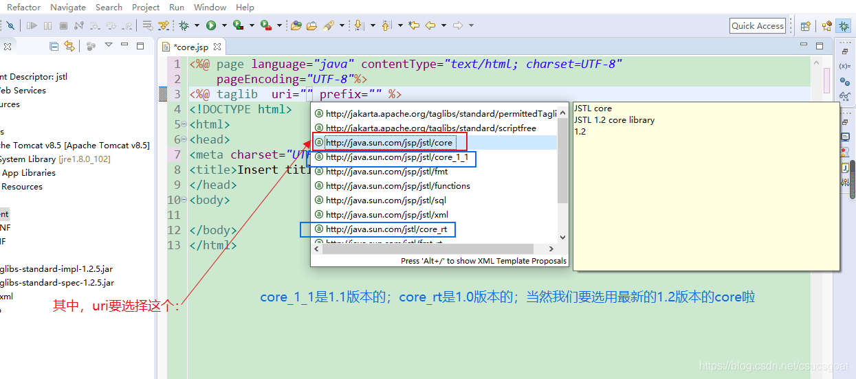 再次说明:如果想使用JSTL1.2版本:uri必须要写对: