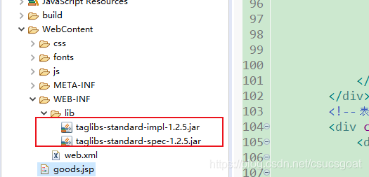 (2)要想使用EL表达式和JSTL表达式,必须将taglibs-standard-impl-1.2.5和taglibs-standard-spec-1.2.5这两个jar包复制到WebContent→WEB-INF→lib目录下:
