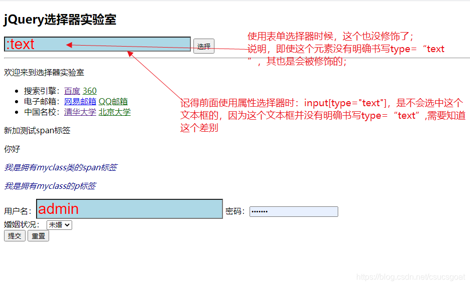 (2):text选择所有单行文本框,即type=text-集合元素;