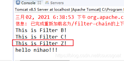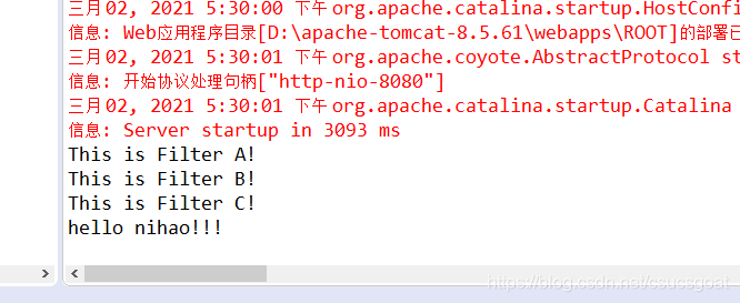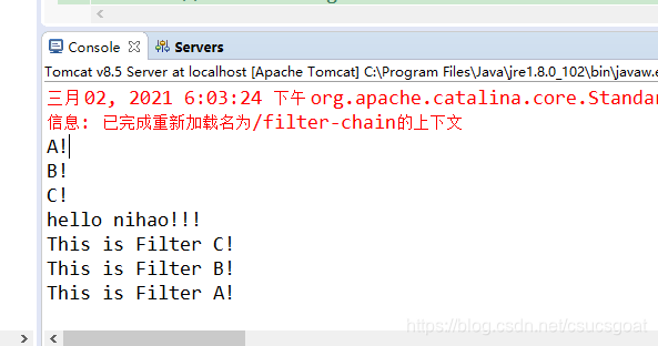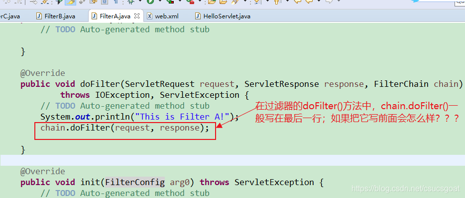 原因解释:FilterA,FilterB,FilterC这三个过滤器的doFilter()方法中,chain.doFilter()都放在了前面,这意思就是,当请求过来的时候,这个过滤器会执行chain.doFilter()方法,当执行到chain.doFilter()这条语句的时候,就会把请求传递给下一个过滤器了,这样从FilterA传到FilterB,从FilterB传到FilterC,控制台就依次打印了A!,B!和C!;一直传给了HelloServlet,输出“hello nihao!!!”;