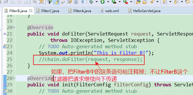 案例:包括,FilterA,FilterB,FilterC三个过滤器,web.xml配置文件,HelloServlet这个Servlet: