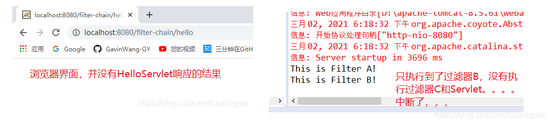 同时,在控制台:按照在web.xml中<filter-mapping>的书写顺序,依次执行三个过滤器;当执行到过滤器C的时候,接下来没有过滤器了,就将请求传递到HelloServlet;