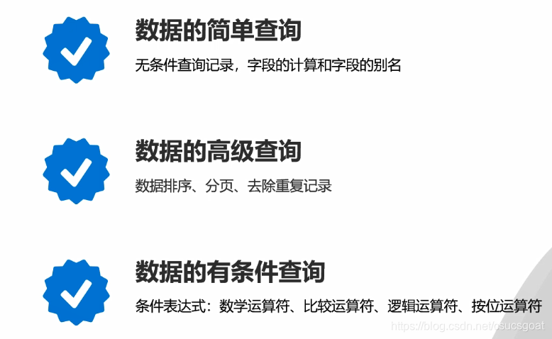 ● 数据的有条件查询:编写条件表达式需要用到数学运算符,比较运算符等运算符;