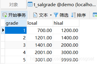 grade:工资分级;losal:本等级最低工资;hisal:本等级最高工资;