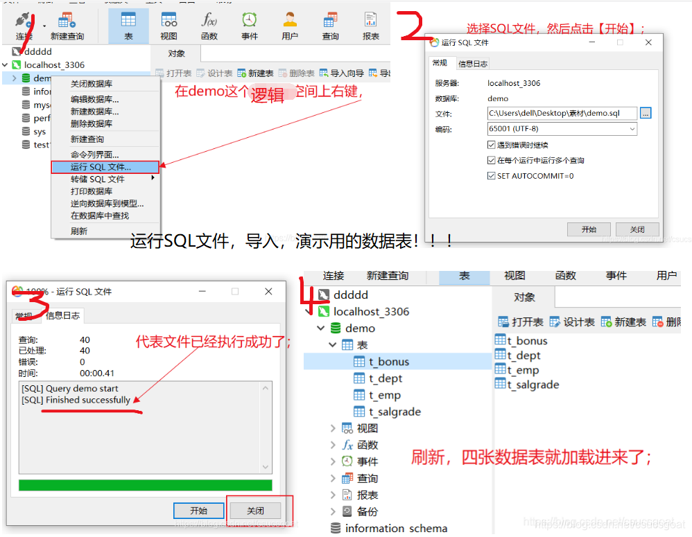 为了演示,先导入需要的逻辑表:使用一个demo.sql文件(里面是创建表的SQL语句)来创建需要的表;