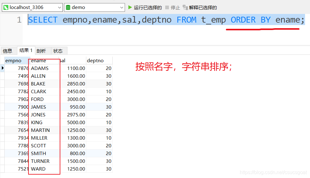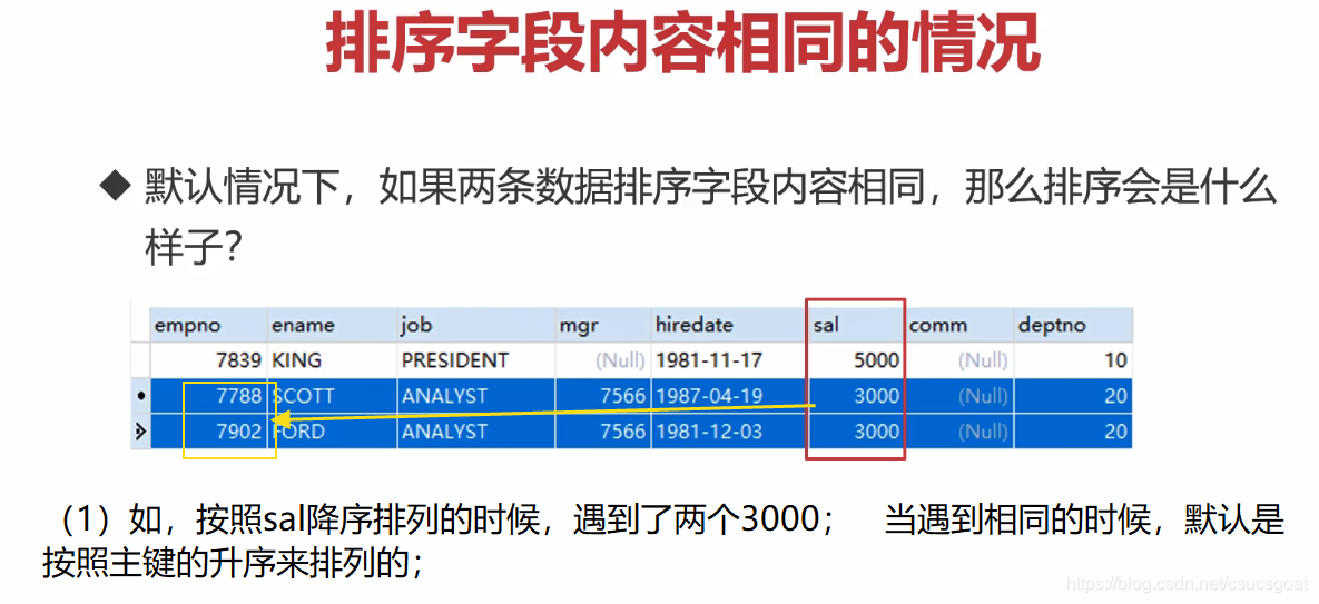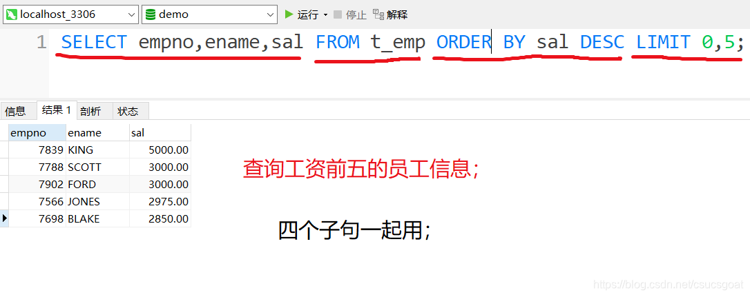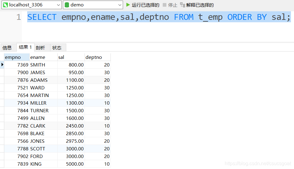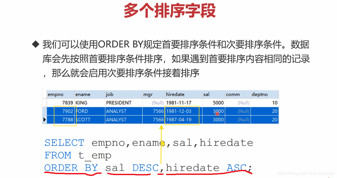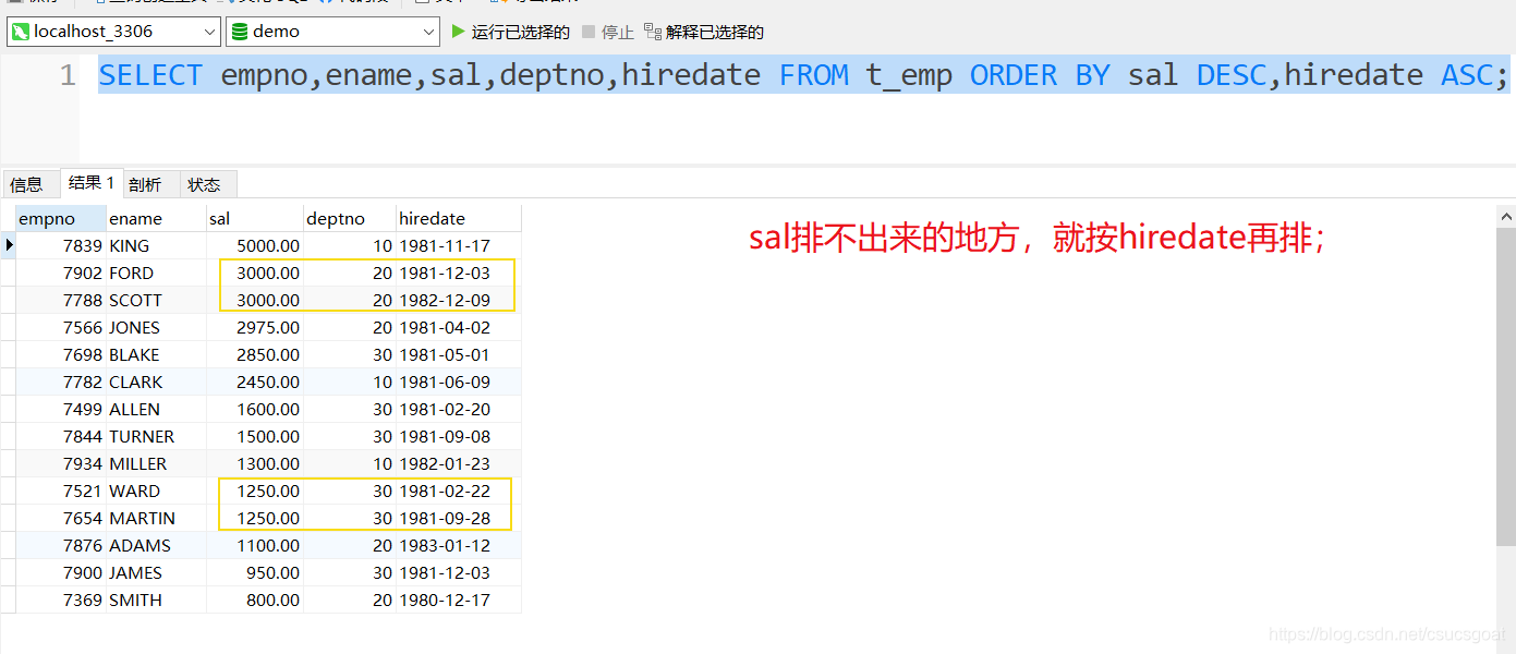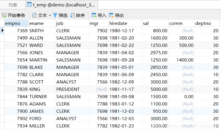 empno:员工编号(主键字段);ename:员工姓名;job:员工职务;mgr:当前员工上司的员工编号;hiredate:入职日期;sal:月薪;comm:佣金;deptno:员工所属部门编号;